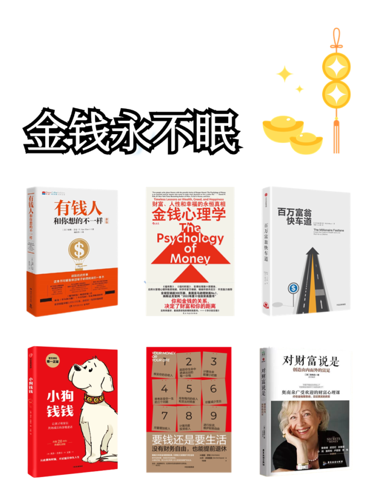 本期主题为“金钱永不眠”,参考的书:《金钱心理学》、《有钱人和你想的不一样》、《百万富翁快车道》、《小狗钱钱》、《要钱还是要生活》和《对财富说是》。